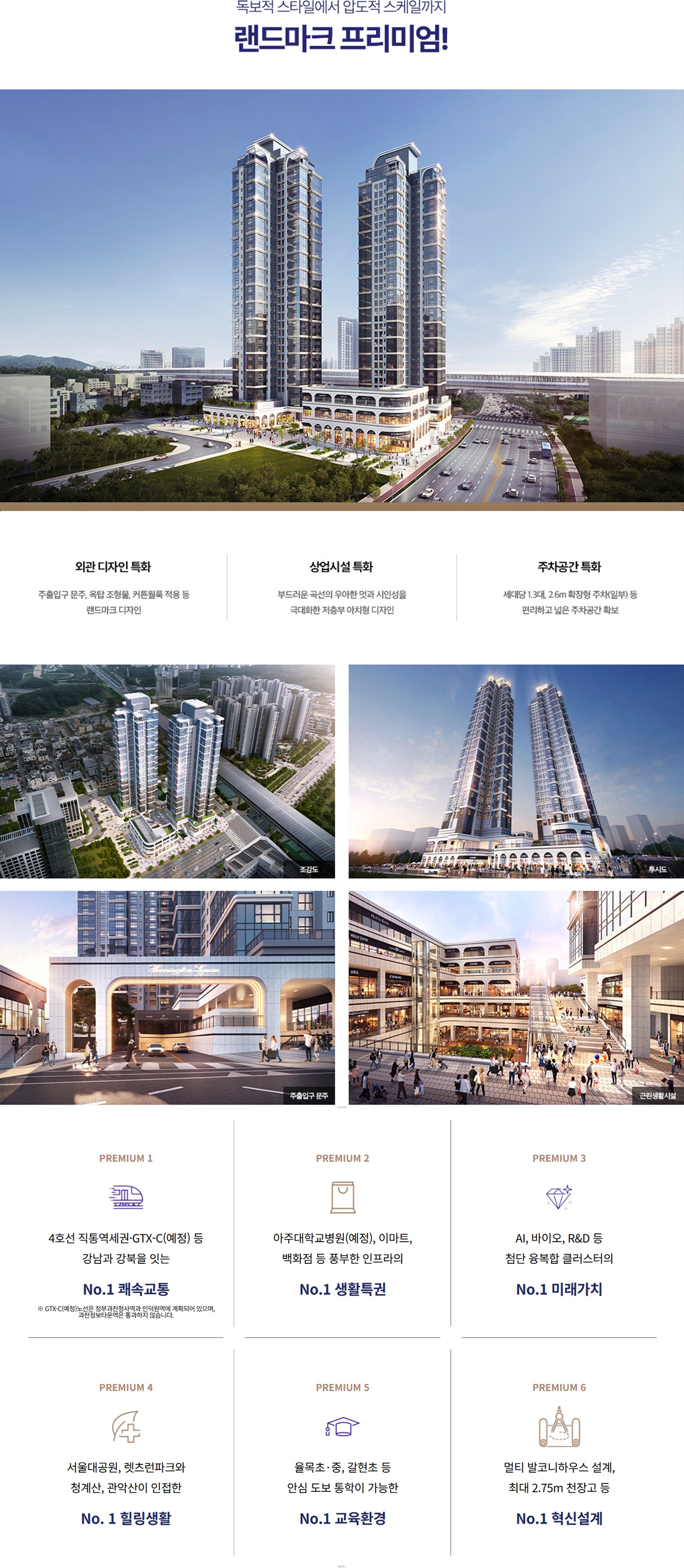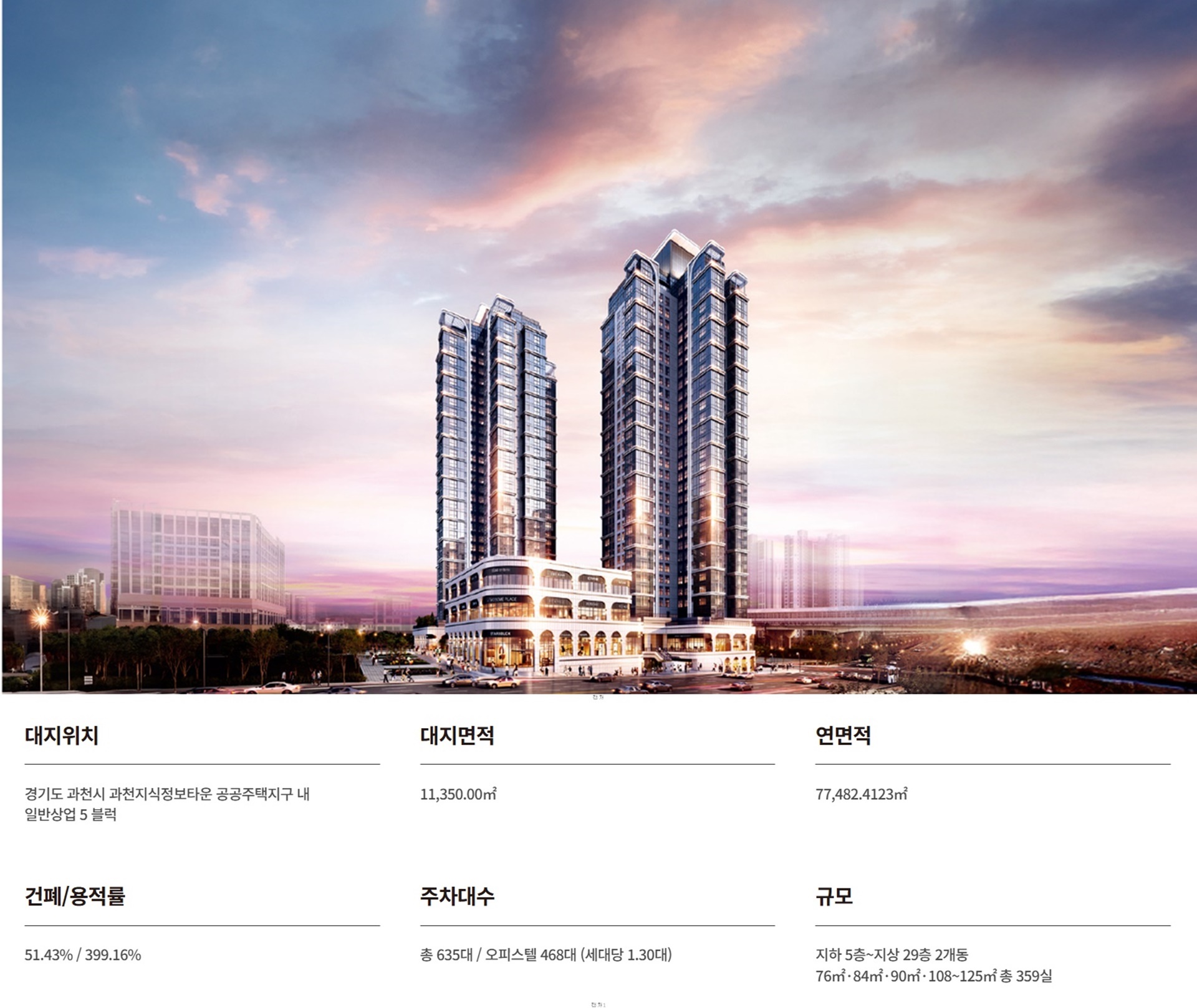 직통 연결 초역세권 4호선 과천정보타운역 (예정) 연결 개통 예정인 4호선 과천정보타운역과 단지 내 지하보도로 직통 연결되는 독보적인 교통 프리미엄 선점. 미래 교통 혁신 GTX-C, 월판선 등 광역 교통망 (예정) GTX-C, 월판선, 위례-과천선 등 다양한 교통 호재가 집중되어 강남 및 수도권 전역 접근성 대폭 강화. 과천지정타 핵심 입지 첨단 기업 집적단지의 직주근접 100여 개 기업과 약 3만 명 직장인 배후 수요를 품은 과천지식정보타운 내 최중심 위치. 과천 유일 29층 랜드마크 커튼월룩 디자인의 초고층 위용 지상 29층의 초고층 설계와 커튼월룩 외관으로 과천의 스카이라인을 바꾸는 압도적 상징성. 고급 주거 및 상업 복합 원스톱 라이프를 실현하는 단지 주거 시설과 상업 시설이 결합된 도심형 복합 공간으로 생활 편의성과 자족 기능 극대화. 프리미엄 커뮤니티 호텔식 로비 및 다양한 특화 시설 호텔식 로비, 피트니스센터, 프라이빗 라운지 등 입주민의 품격을 높이는 고급 커뮤니티 조성. 높은 공간 활용도 중대형 중심 구성 및 멀티 발코니 설계 선호도 높은 중대형 평면 위주 구성 (76㎡~125㎡) 및 세대당 멀티 발코니 제공으로 실사용 면적 및 개방감 극대화.